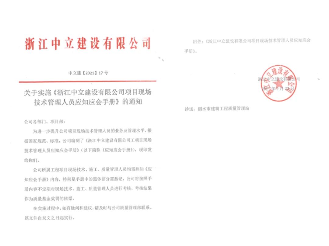 為進(jìn)一步提升公司項(xiàng)目現(xiàn)場技術(shù)管理人員的整體業(yè)務(wù)和管理水平,積極開展“質(zhì)量月”活動,根據(jù)國家標(biāo)準(zhǔn)規(guī)范,中立建設(shè)編制了《浙江中立建設(shè)有限公司工項(xiàng)目現(xiàn)場技術(shù)管理人員應(yīng)知應(yīng)會手冊》,并于9月23日發(fā)文實(shí)施。這是繼今年6月份我公司出臺的《工程質(zhì)量通病防治(2021試行)》后的又一重要技術(shù)性手冊。